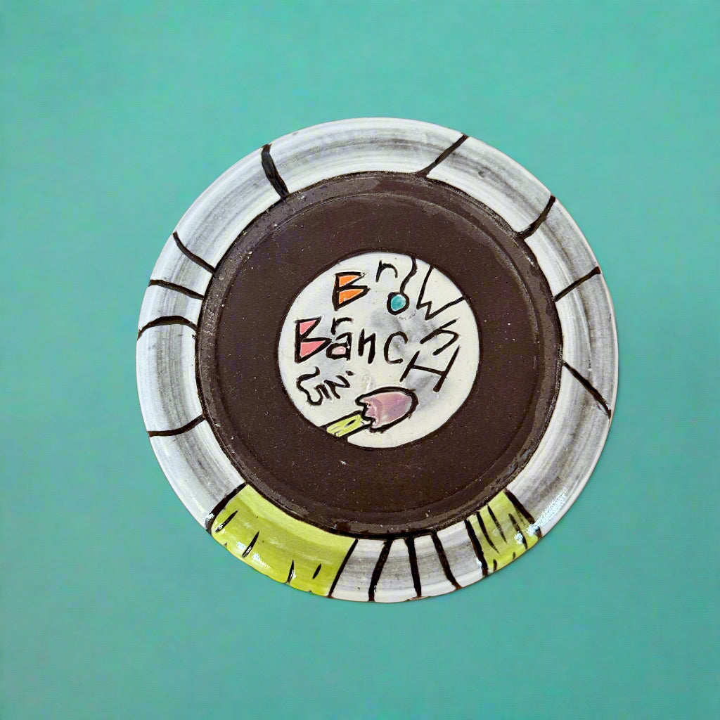 This 5" dark stoneware bubble plate was wheel-thrown, layered in slips and underglaze, and carved back to reveal tall, cartoon-like mushrooms in bright color. One of a kind, with a hollow outside.