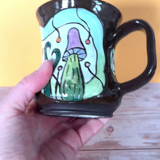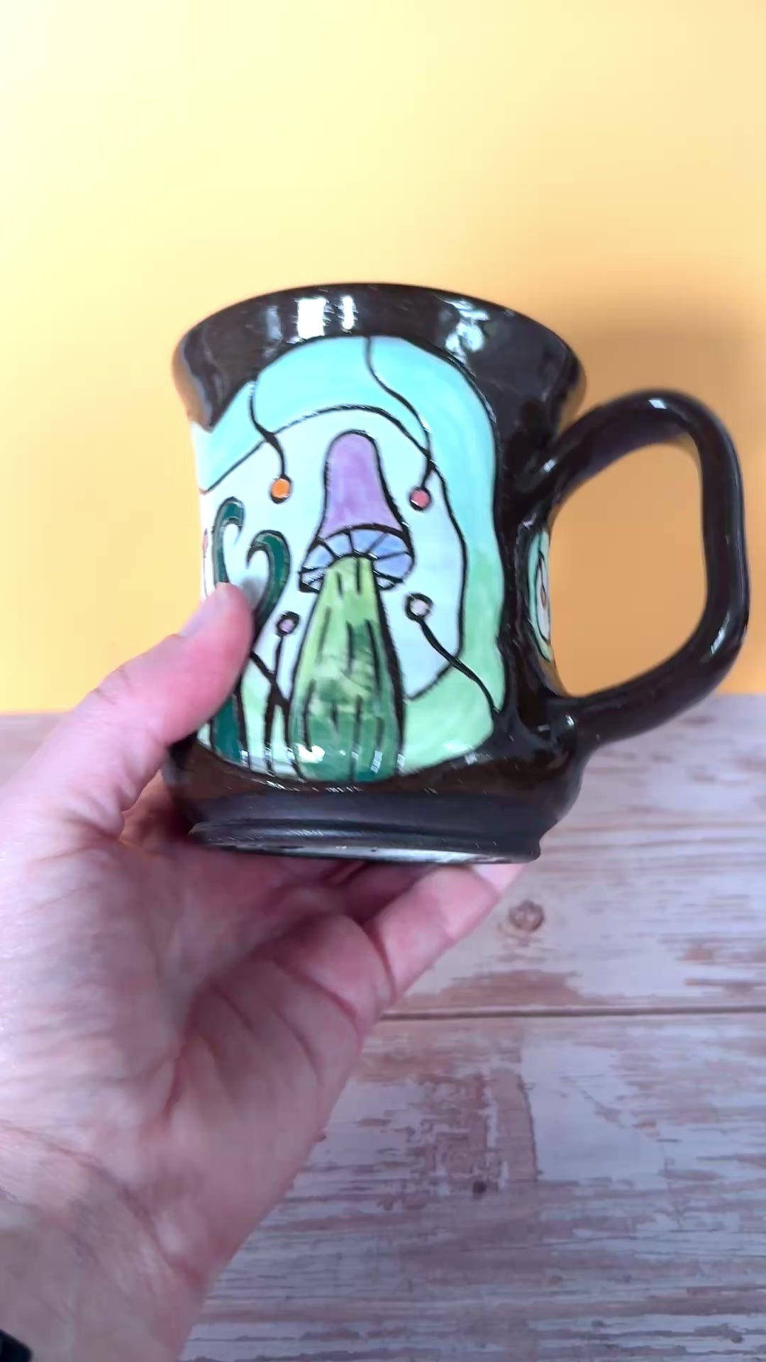 Handmade on the wheel with chocolate stoneware, layered in white slip and colorful underglaze, then carved back to let the clay show through. I call these “midcentury maximalist” mugs, made for anyone who loves bold colors and wants something fun to drink their coffee, tea, or beverage of choice out of.