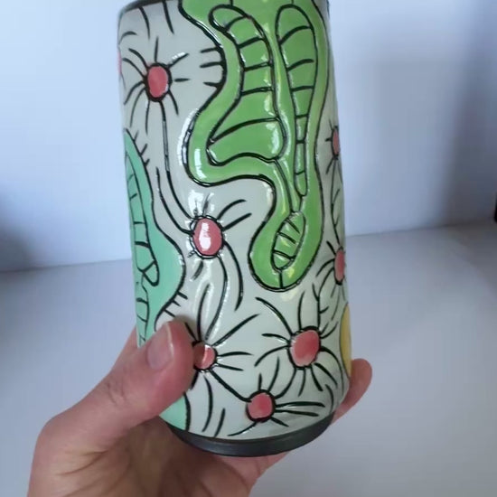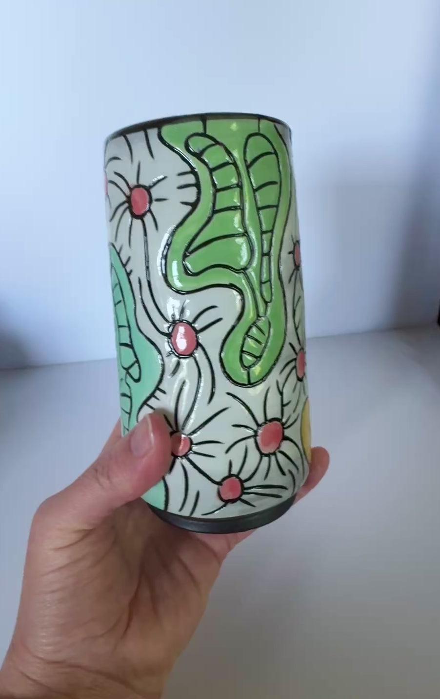 This 6" dark stoneware vase is layered with slips and underglaze for an ombre effect, then carved back to reveal the chocoloate clay. This is completely one of a kind, like all of my pots, and the only one I’ve made in this style. Perf for dried flowers or any kind fo flowers.