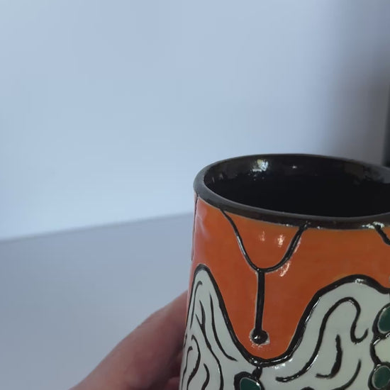 This 6" dark stoneware vase is layered with slips and underglaze for an ombre effect, then carved back to reveal the chocolate clay. It’s completely one of a kind, the only piece I’ve made in this style. Perfect for dried stems or fresh flowers.