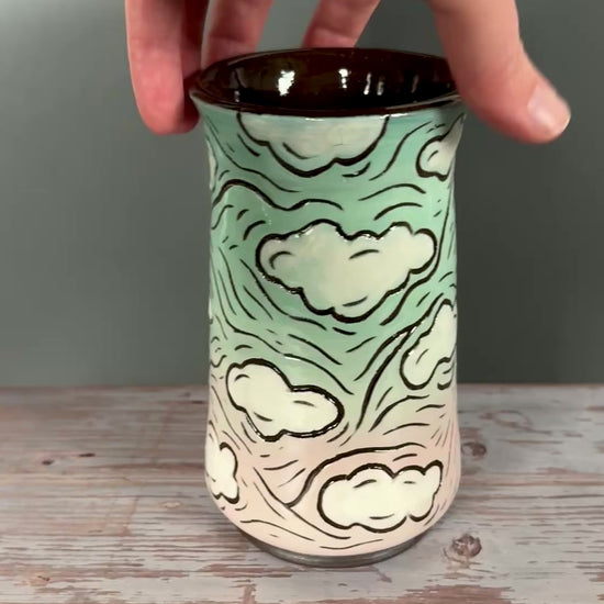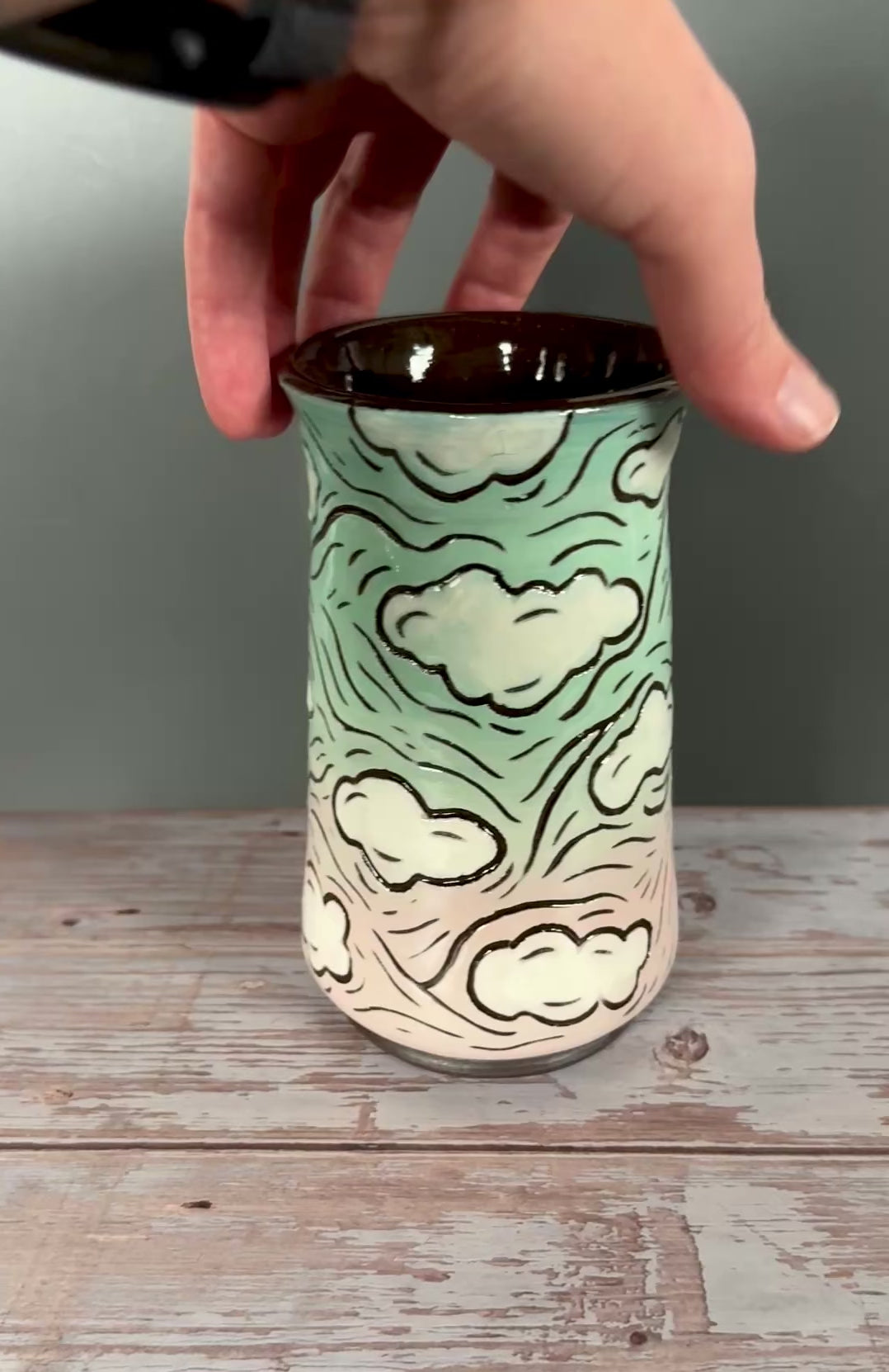 This 6" dark stoneware vase is layered with slips and underglaze for an ombre effect, then carved back to reveal clouds and flowing lines. It’s one of a kind, the only one I’ve made in this style.