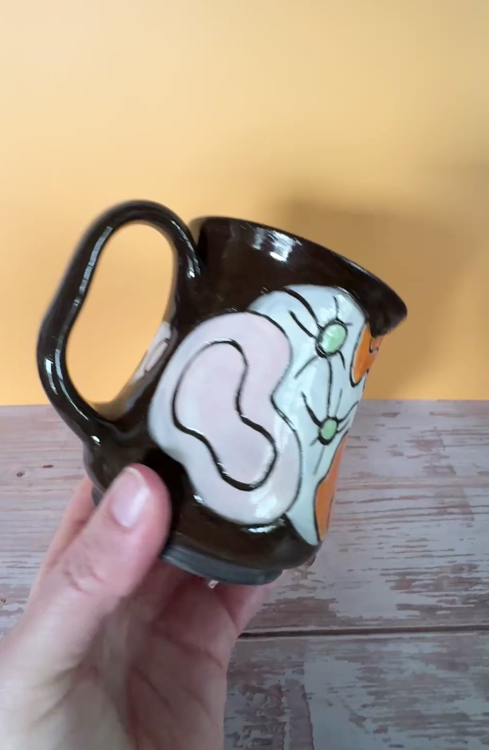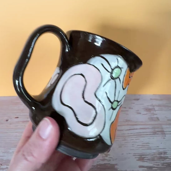 Handmade on the wheel with chocolate stoneware, layered in white slip and colorful underglaze, then carved back to let the clay show through. I call these “space urchin” mugs, made for anyone who loves bold color and wants something that stands out in a midcentury maximalist cabinet.